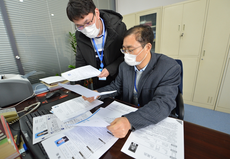 2月26日,淮北礦業(yè)集團負責(zé)高校畢業(yè)生招聘的人員在審核應(yīng)聘者個人簡歷和學(xué)歷資料。陳磊 攝