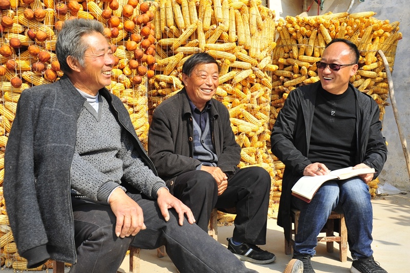 省優(yōu)秀下派干部、淮北礦業(yè)集團(tuán)扶貧干部楊占勇(右一)與村民共話豐收喜悅(喬時(shí)慶 攝)