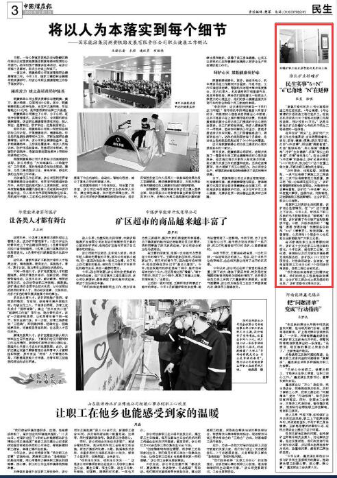 在年初礦“兩會”上,該礦向廣大職工作出鄭重承諾,全年將圍繞餐飲、洗浴、安居、健康、便捷、娛樂等方面,辦好“6件實事”,即創(chuàng)建“滿意食堂”、打造“星級浴池”、用心搭建“溫馨港灣”、守護“生命健康”、樂享“指尖上的幸?!薄⒈M情“愉悅身心”。在全力做好“6件實事”的基礎(chǔ)上,該礦還表示將以“6+N”的形式,努力在“N”這個變量上做文章,不斷為職工增加民生福祉。