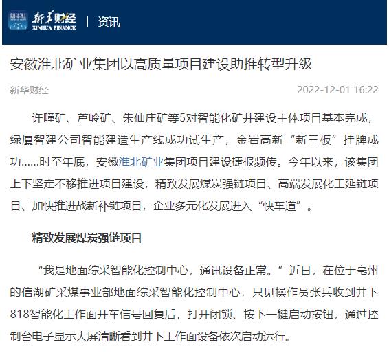 許疃礦、蘆嶺礦、朱仙莊礦等5對(duì)智能化礦井建設(shè)主體項(xiàng)目基本完成,綠廈智建公司智能建造生產(chǎn)線成功試生產(chǎn),金巖高新“新三板”掛牌成功……時(shí)至年底,安徽淮北礦業(yè)集團(tuán)項(xiàng)目建設(shè)捷報(bào)頻傳。今年以來(lái),該集團(tuán)上下堅(jiān)定不移推進(jìn)項(xiàng)目建設(shè),精致發(fā)展煤炭強(qiáng)鏈項(xiàng)目、高端發(fā)展化工延鏈項(xiàng)目、加快推進(jìn)戰(zhàn)新補(bǔ)鏈項(xiàng)目,企業(yè)多元化發(fā)展進(jìn)入“快車(chē)道”。