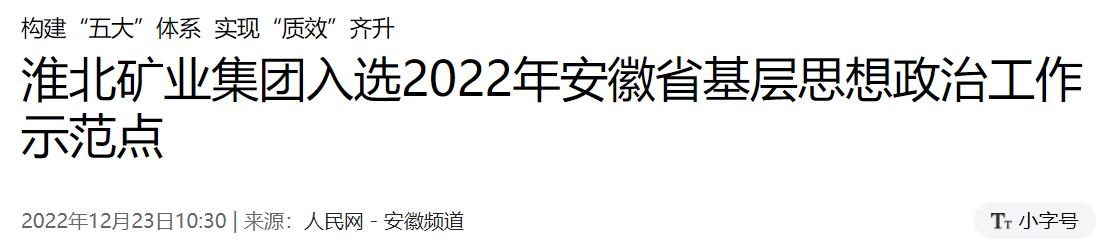 近日,中共安徽省委宣傳部發(fā)布“2022年安徽省基層思想政治工作示范點”名單,淮北礦業(yè)集團成功入選。