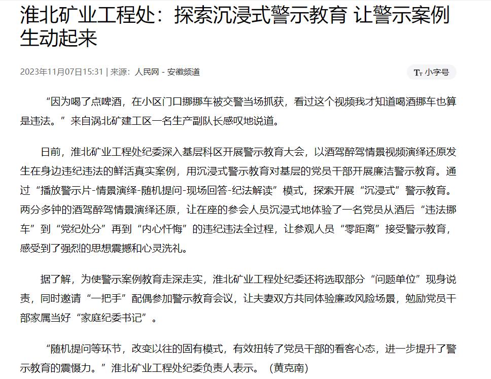 日前,淮北礦業(yè)工程處紀(jì)委深入基層科區(qū)開展警示教育大會,以酒駕醉駕情景視頻演繹還原發(fā)生在身邊違紀(jì)違法的鮮活真實(shí)案例,用沉浸式警示教育對基層的黨員干部開展廉潔警示教育。通過“播放警示片-情景演繹-隨機(jī)提問-現(xiàn)場回答-紀(jì)法解讀”模式,探索開展“沉浸式”警示教育。兩分多鐘的酒駕醉駕情景演繹還原,讓在座的參會人員沉浸式地體驗(yàn)了一名黨員從酒后“違法挪車”到“黨紀(jì)處分”再到“內(nèi)心懺悔”的違紀(jì)違法全過程,讓參觀人員“零距離”接受警示教育,感受到了強(qiáng)烈的思想震撼和心靈洗禮。