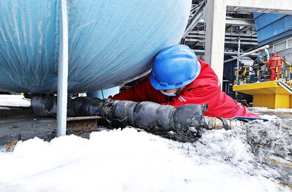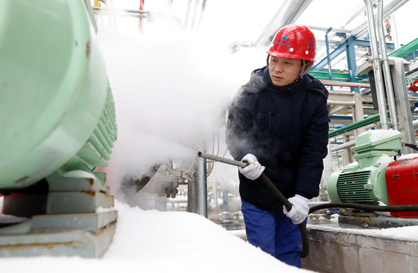 碳鑫科技一名職工用蒸汽為設(shè)備除雪除冰,保障設(shè)備運行正常。王明明攝